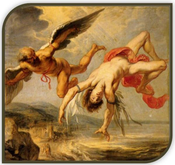 A cause de ses trahisons répétées, l'inventeur athénien Dédale est jeté avec son fils Icare dans le labyrinthe qu'il a construit en Crète. Ne pouvant s'enfuir, Dédale eut l'idée de fabriquer des ailes en cire et en plume. Il dit à son fils de ne surtout pas s'approcher de la mer, à cause de l'humidité, ni du soleil, à cause de la chaleur. Mais Icare l'oublie et prend trop d'altitude et la chaleur fait fondre ses ailes. Il meurt, précipité dans la mer qui porte désormais son nom : la mer Icarienne.